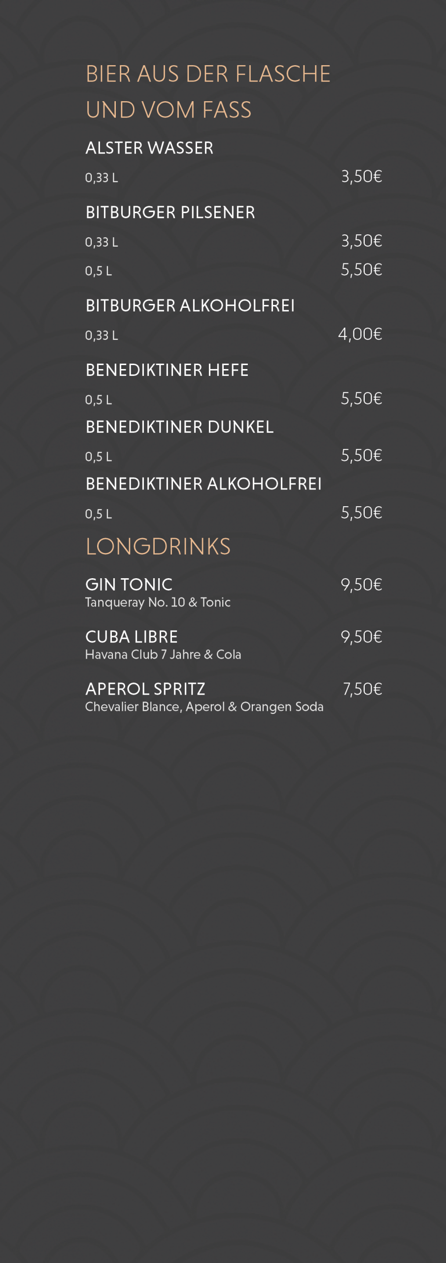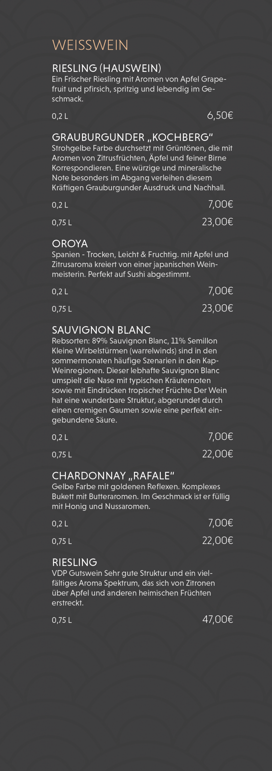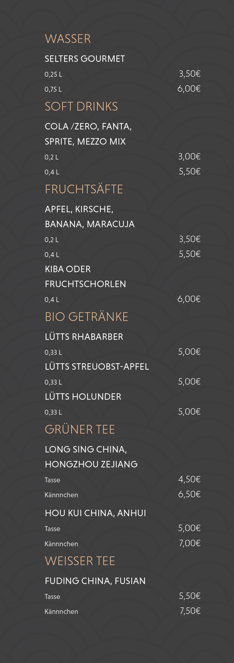 Genieße unsere erlesene Getränkeauswahl: kühle Softdrinks und Bio-Varianten, aromatische Tees und Kaffee sowie sorgfältig ausgewählte Weine und Longdrinks. Ob passend zu Sushi, als Begleiter zu Poké-Bowls oder einfach zum Wohlfühlen – unsere Drinks ergänzen dein Geschmackserlebnis perfekt. Von spritzig-frisch bis elegant-würzig ist für jeden Anlass etwas dabei.