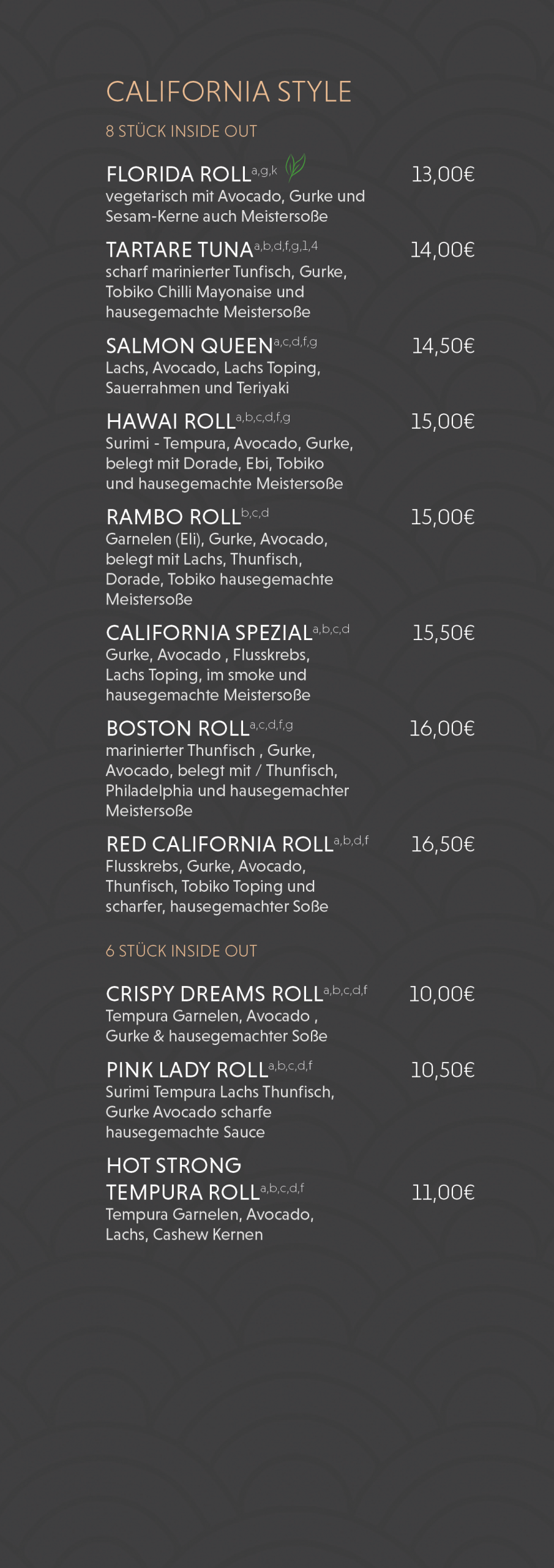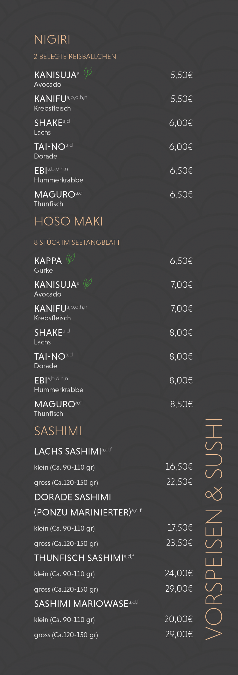 Tauche ein in unsere kulinarische Welt mit kunstvoll zubereiteten Sushi-Kreationen, klassischen Nigiri & Hosomaki, kreativen California-Rolls sowie frischem Sashimi und leckeren Poké-Bowls. Unsere Speisekarte vereint traditionelle japanische Handwerkskunst mit modernen Aromen – perfekt für alle, die Vielfalt, Frische und Qualität lieben.